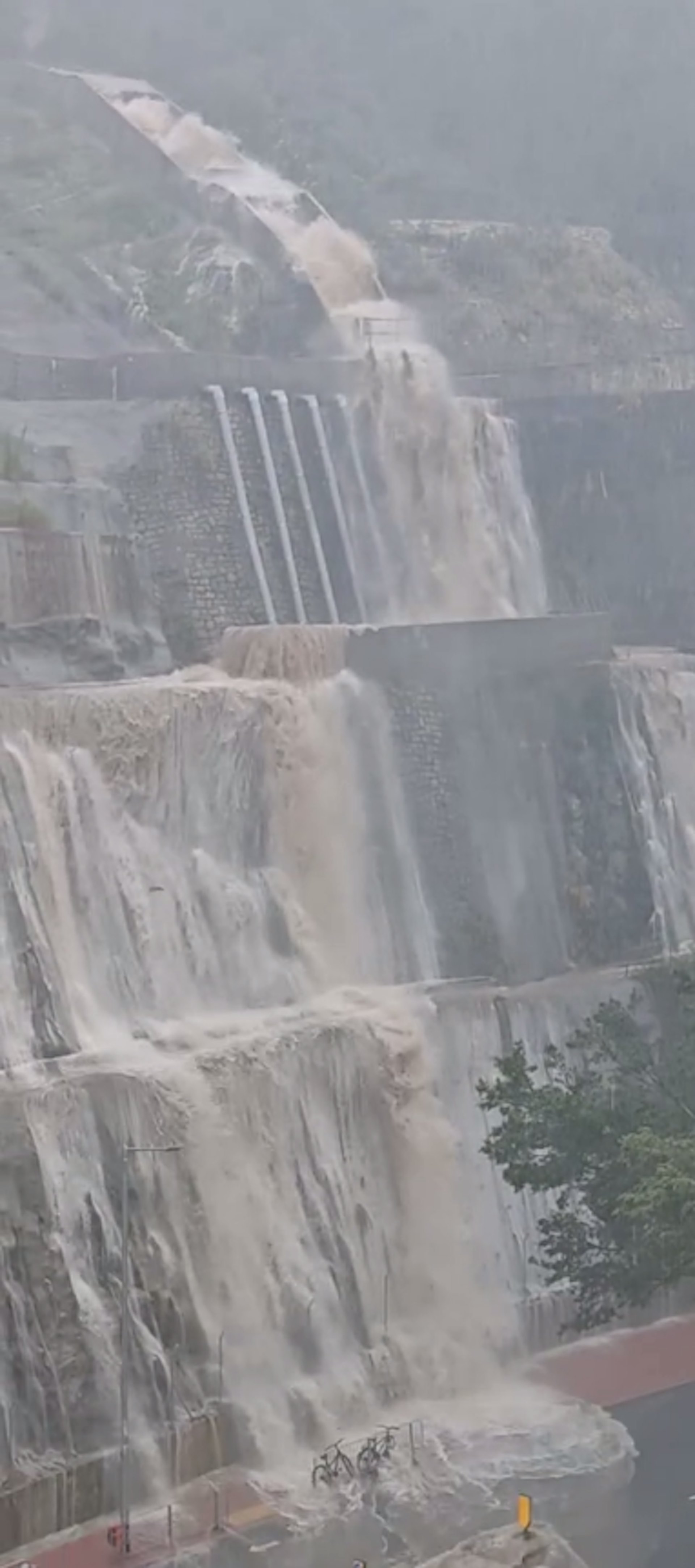 其中筲箕灣耀興道一帶情況尤為嚴峻。有影片顯示,大量夾雜黃泥的雨水從山邊護土牆上的排水渠洶湧傾瀉而下,猶如人造瀑布般翻滾。護土牆一度被黃濁泥水完全覆蓋,水勢強勁,泥水直衝行人道及馬路,行車及行人通行受阻,場面震撼。