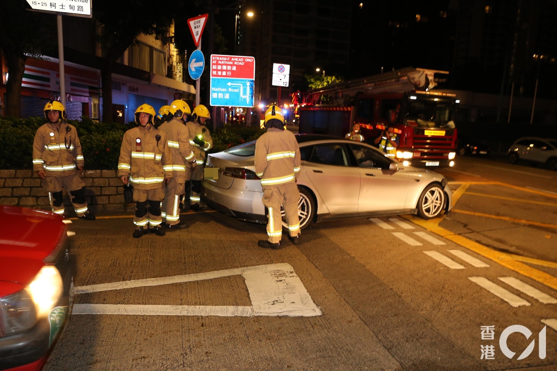 Tesla駛至柯士甸道148號對開,懷疑失控「自炒」撞向花槽石壆,司機立即下車逃走,警方和消防到場調查。(黃江奇攝)