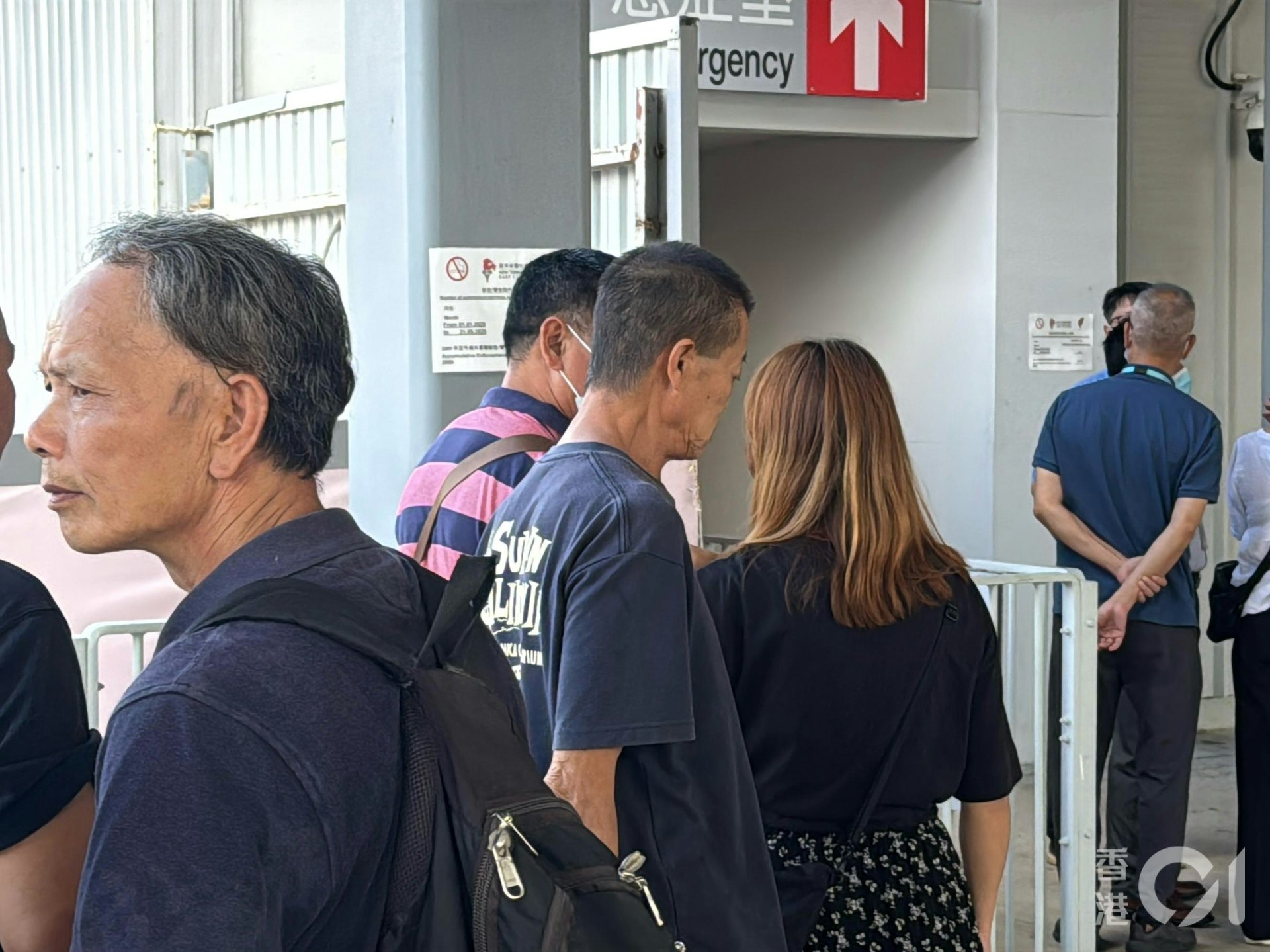 古洞北公屋地盤發生奪命工傷,死者父親(中間藍衫)抵達北區醫院了解。(蔡正邦攝)