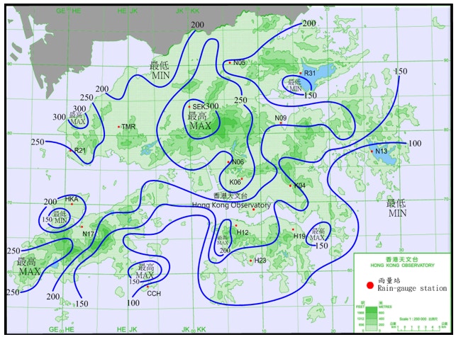2018年9月14日至17日間的雨量分佈,西面錄得的雨量較東面為多,最高達300毫米。(天文台圖片)