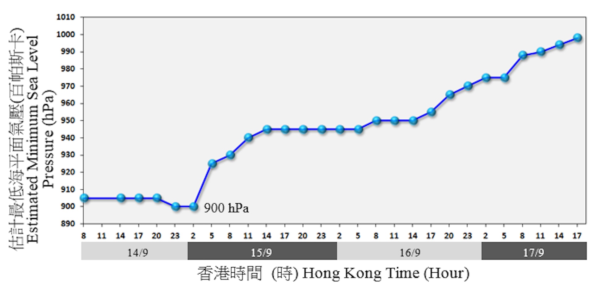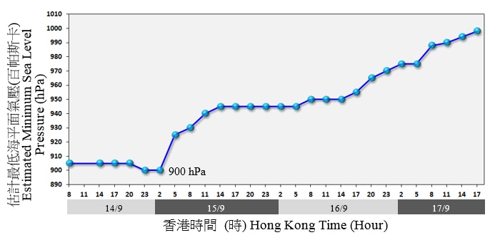 2018年9月14日至17日間,山竹最低海平面氣壓的時間序列,曾於15日凌晨低至900百帕斯卡。(天文台圖片)