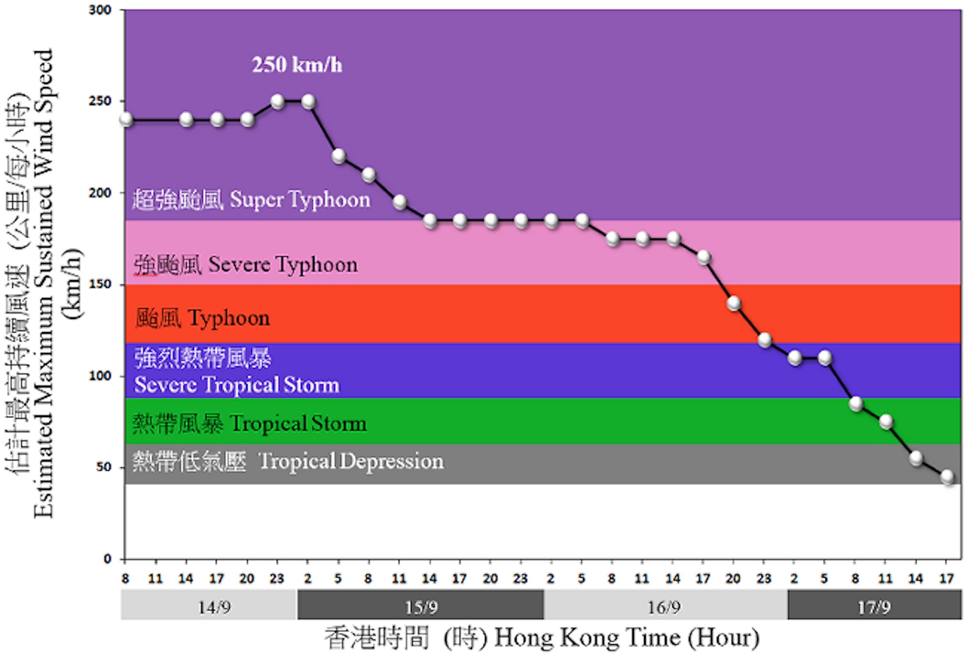 2018年9月14日至17日,山竹最高持續風速的時間序列,顯示最高持續風速達每小時250公里,16日接近香港時維持200公里。(天文台圖片)