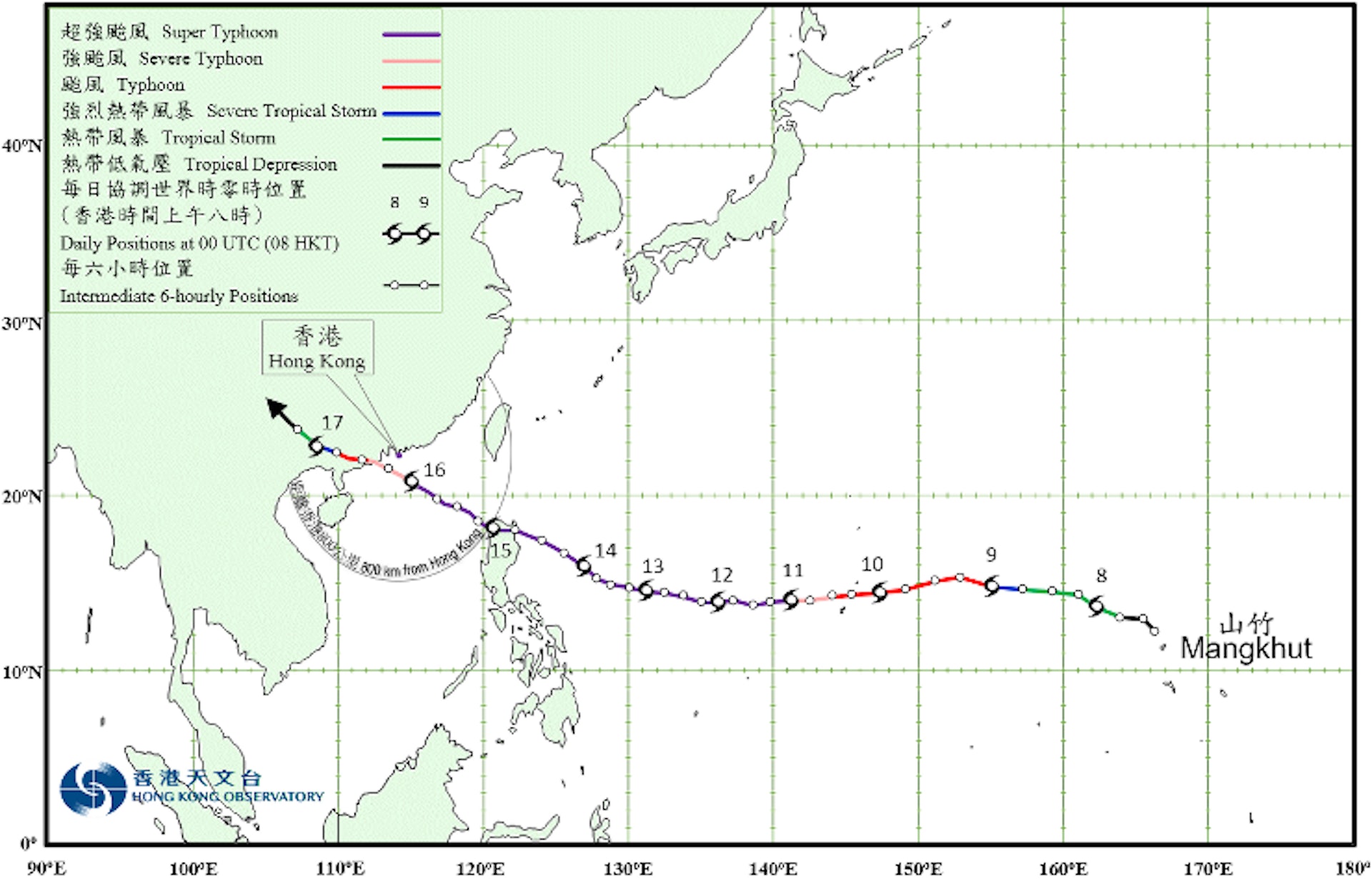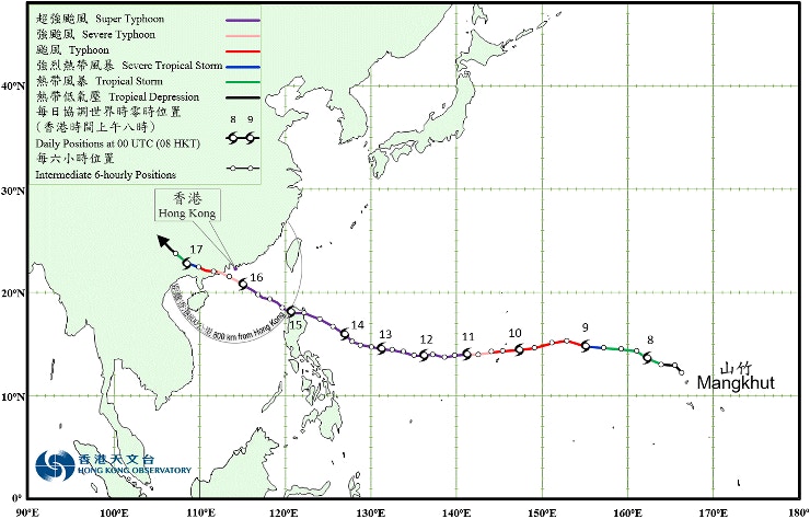 2018年9月7日至17日山竹移動路徑圖,可見大部分時間保持超強颱風級別(9月11至16日)。(天文台圖片)