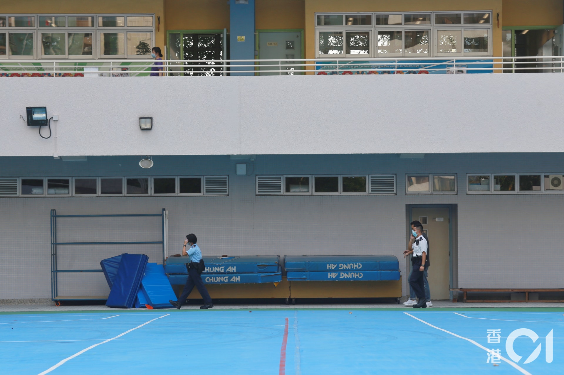 今日(29日)下午1時7分,警方接獲報案指,天水圍天瑞路75號一間小學,有一名男童由高處墮下,倒臥地下位置。(鄧栢良攝)