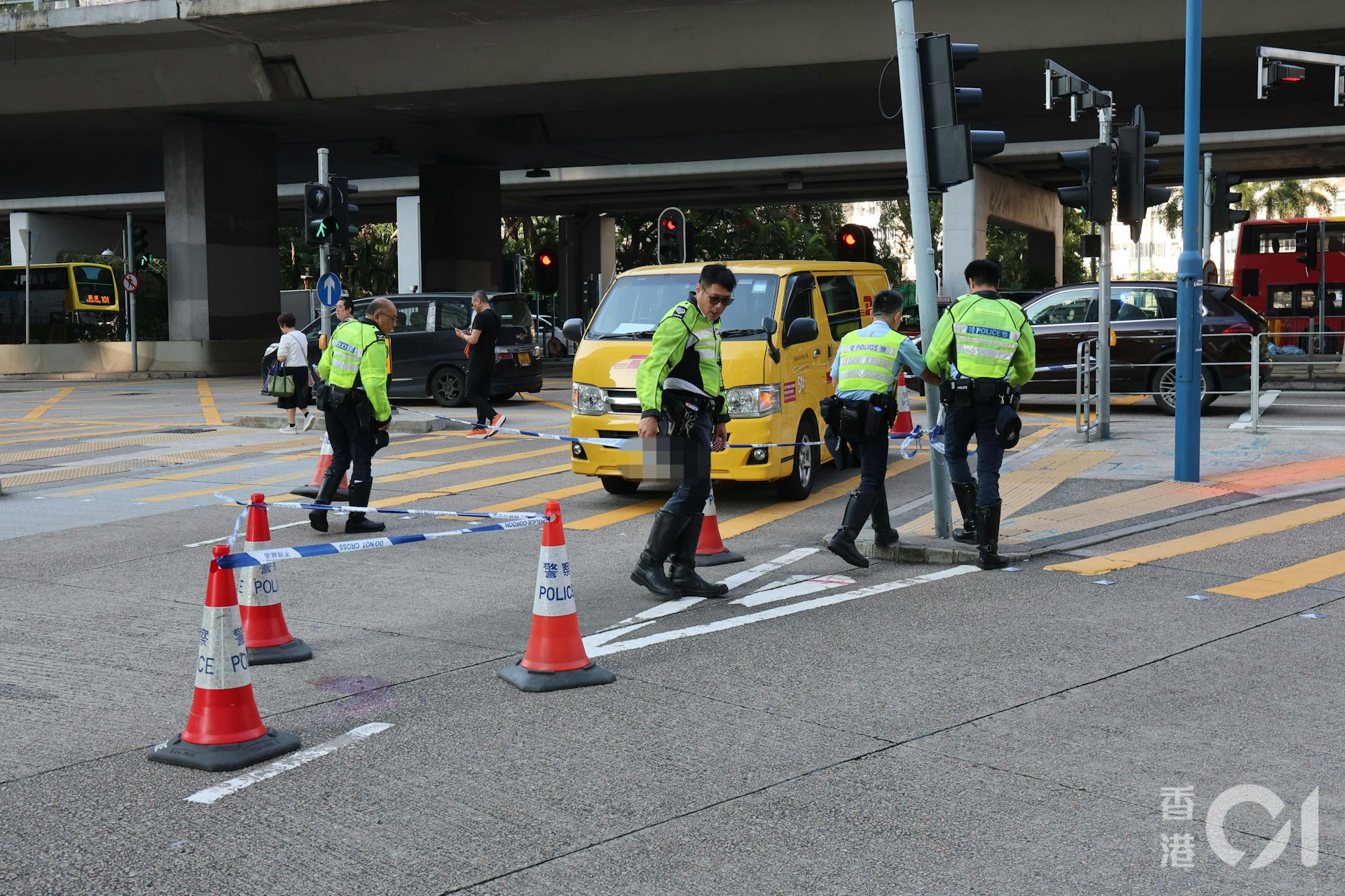 涉事客貨車的男跟車工亦留在現場,協助警方調查事故。