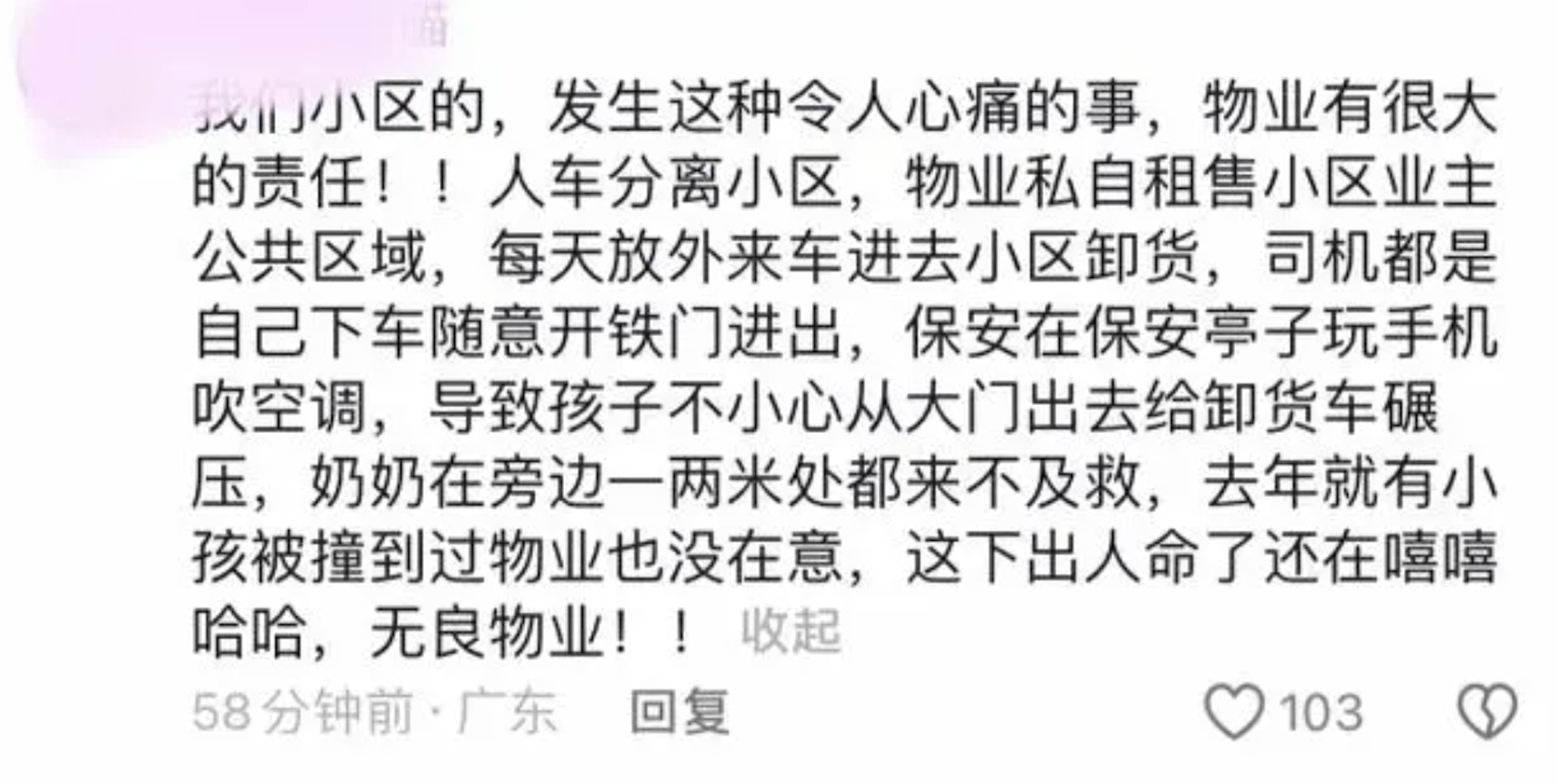 有業主指出,小區原本實行人車分流制度,理應防止此類意外。然而實際管理中,貨車時常自由出入卸貨,保安監管鬆散,加之夜間照明不足,安全隱患早已存在。居民們認為,這次悲劇暴露了小區管理層長期積累的問題。