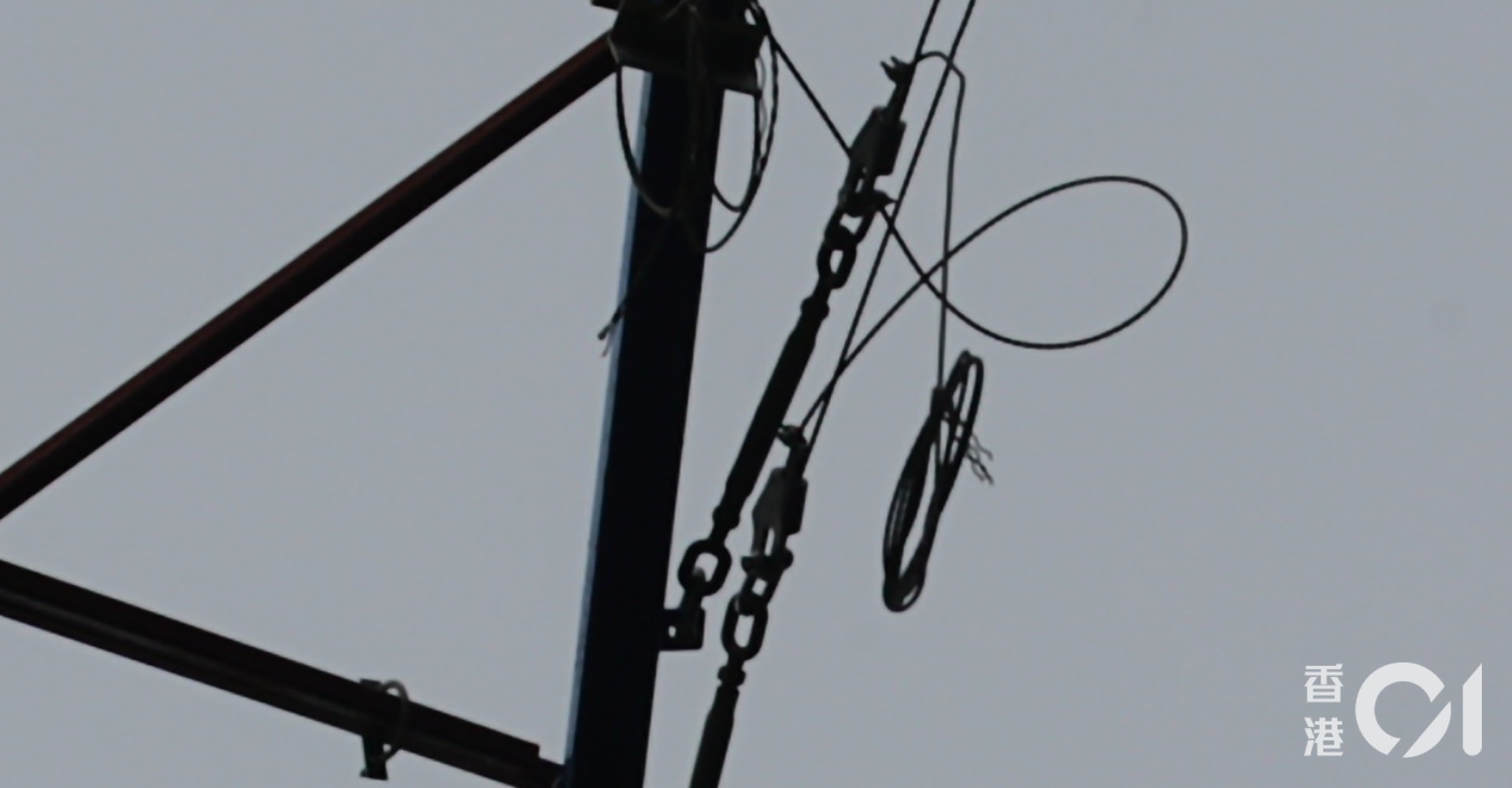 倫敦閣外牆有鋼索斷裂痕跡。(翁鈺輝攝)