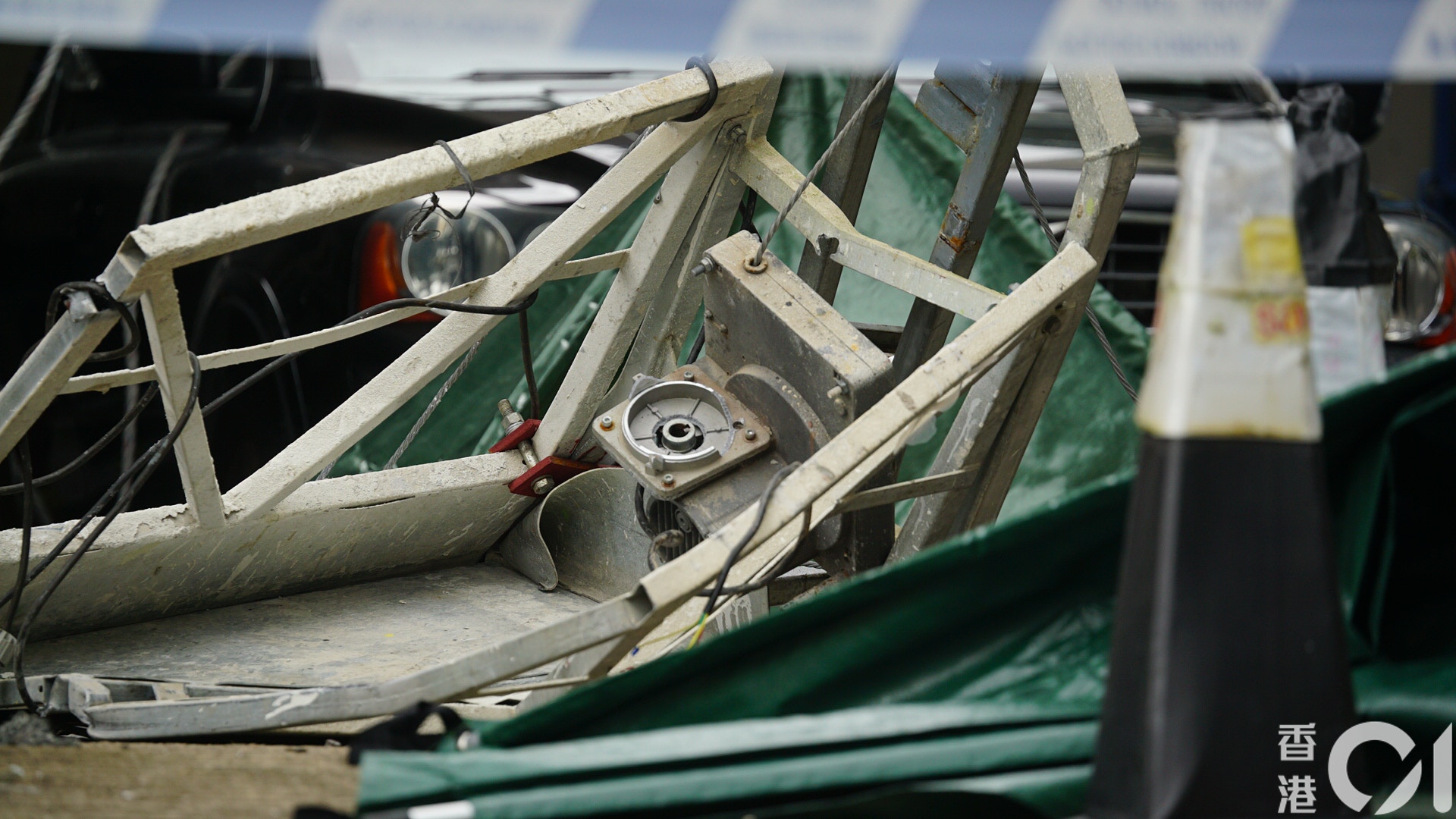 據讀者提供照片可見,大廈外停有一輛搭棚工程車,吊船墜落地點距離車輛僅數米。零件、繩索及工具散落一地,其中一名工人水鞋甩脫,另一人被雜物壓住,地面留有大量血漬。