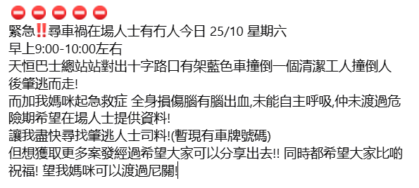 事主的女兒在Facebook上懇求知情者提供資料,協助追查肇事者。
