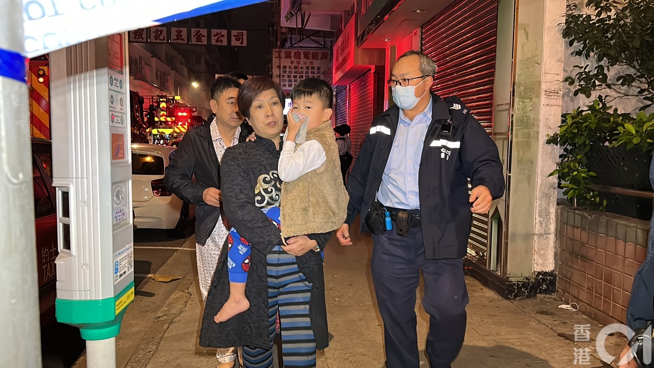 數十名住客疏散,有人手抱幼童。(黃江奇攝)