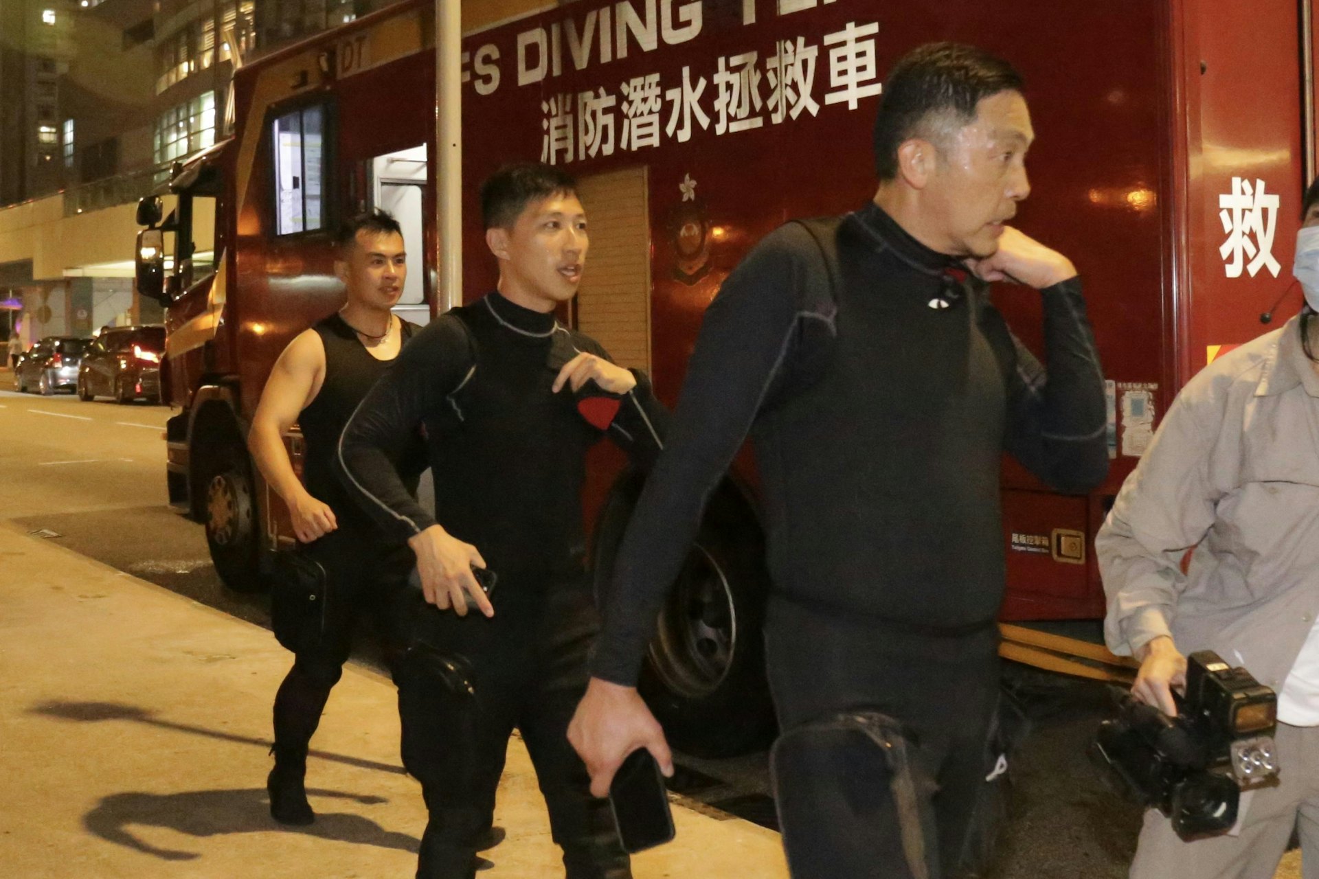 消防潛水拯救隊出動,蛙人落水拯救。(任葆穎攝)
