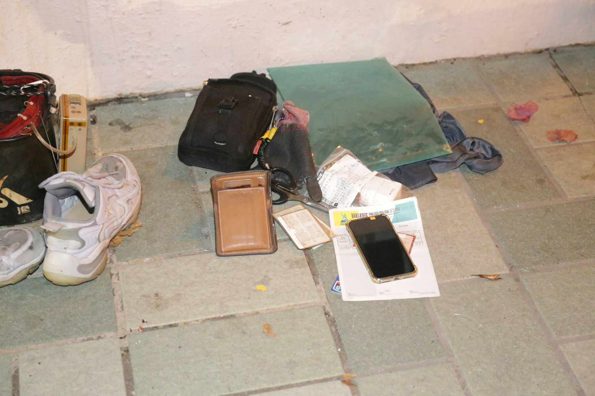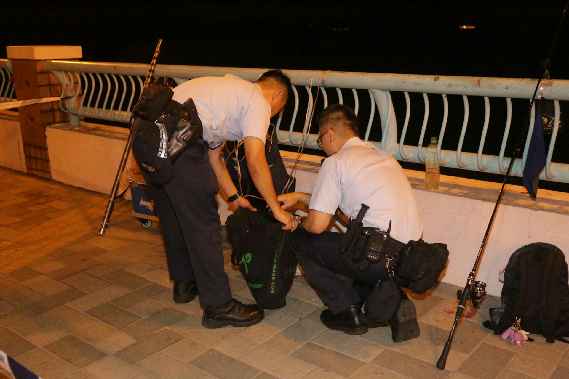 警方翻查岸邊個人物品,追查墮海兩人身分。(任葆穎攝)