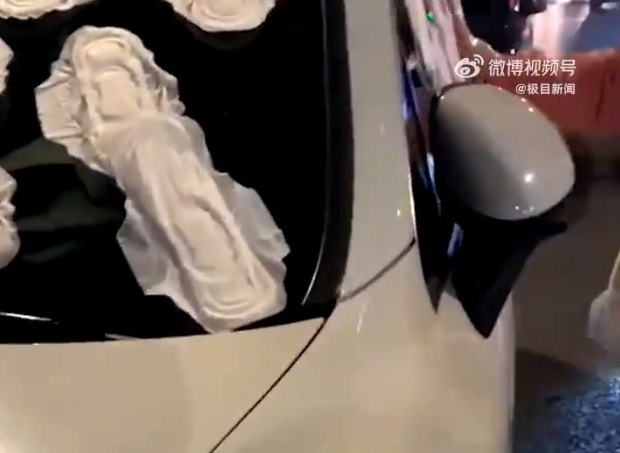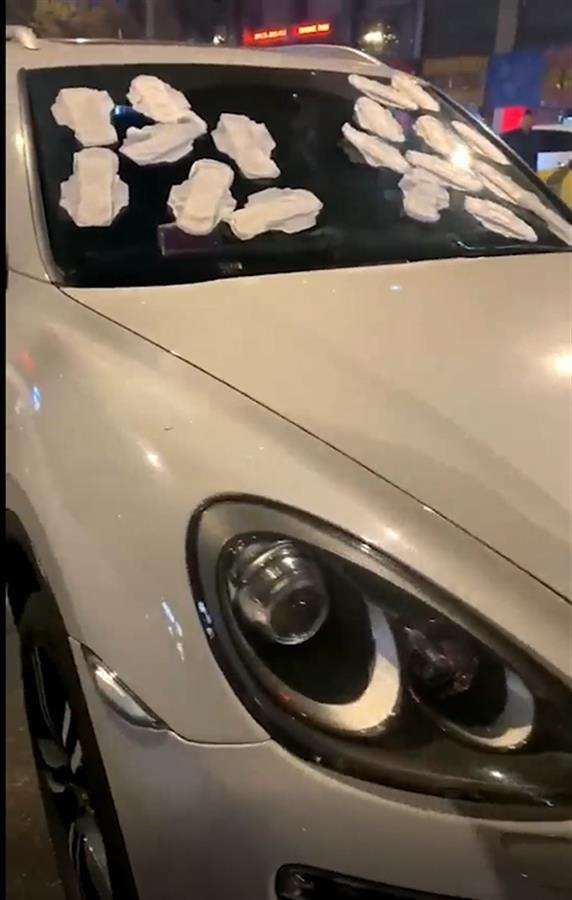 女子苦等對方現身整整三小時仍無結果,怒氣爆表之下轉身走到附近便利店,買下兩至三包衛生巾,隨後將其瘋狂貼滿白色保時捷的擋風玻璃及左右車窗,以行動發洩滿腔不滿。
